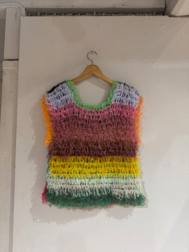 EDNA SS26 【VEST】 ●素材:モヘア100% ●サイズ:ワンサイズ ※サイズ詳細 身幅(ぐるり):約90cm 着丈(ネックポイントから):約55cm ●デザイン上、前後どちらでも着用可能 ●編みにゆとりがあるデザインなので若干の伸縮性があります ●全て手編みのためサイズスペックはアイテムによって個体差がございます ●計測は参考数値となるので若干の誤差が生じることがございます 予めご了承の上ご購入をお願い致します ●スタッフ:レディース166cm / メンズ175cm